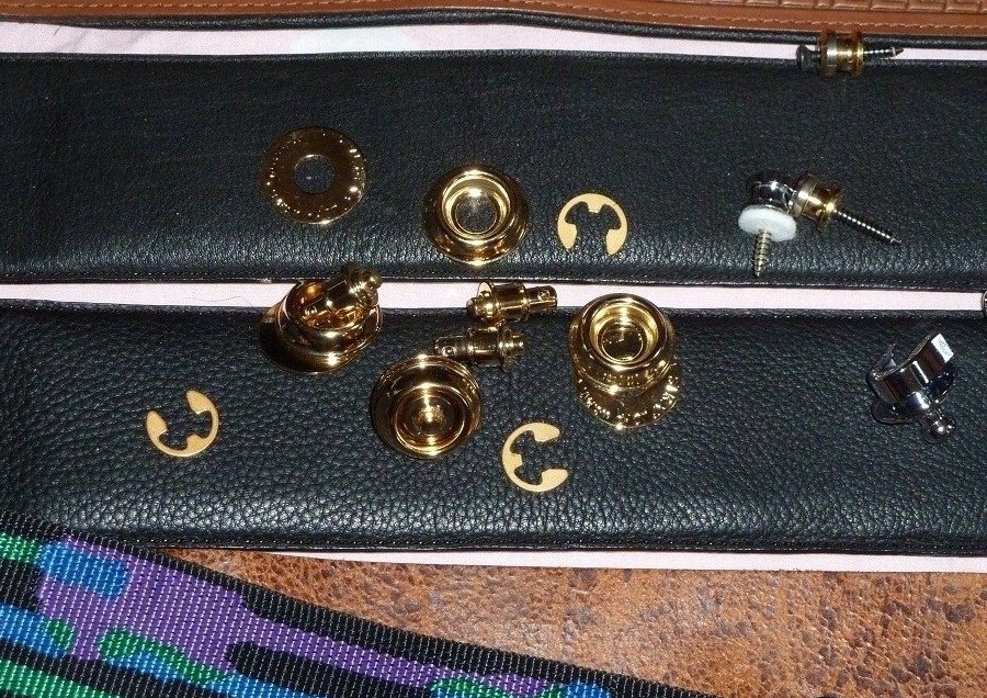 Gibson吉他用電鍍金色按壓式的 其他的吉他[如Fender吉他及貝士吉他]用的是滑入扣式的[電鍍銀色]