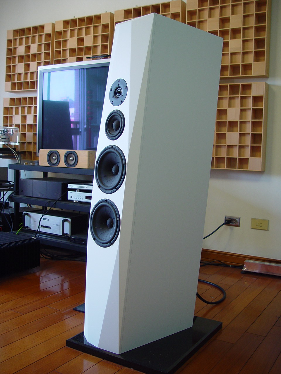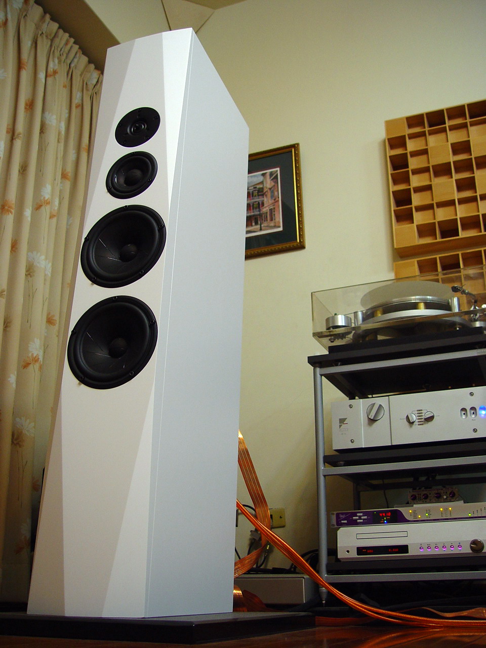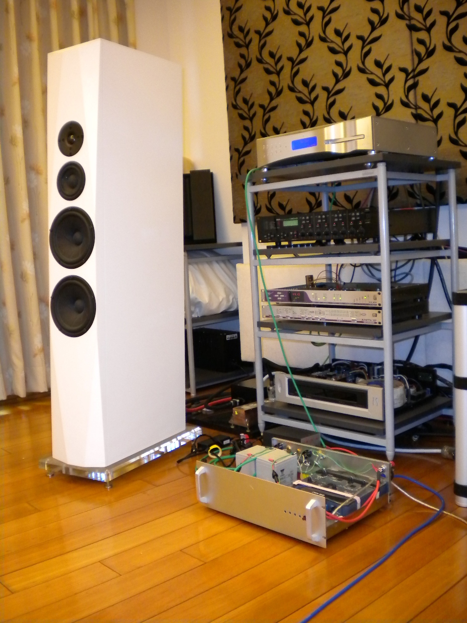 那時喇叭腳座還沒想到該如何製作, 所以是直接放置在黑金石上面. 高音是用Vifa XT25! :)