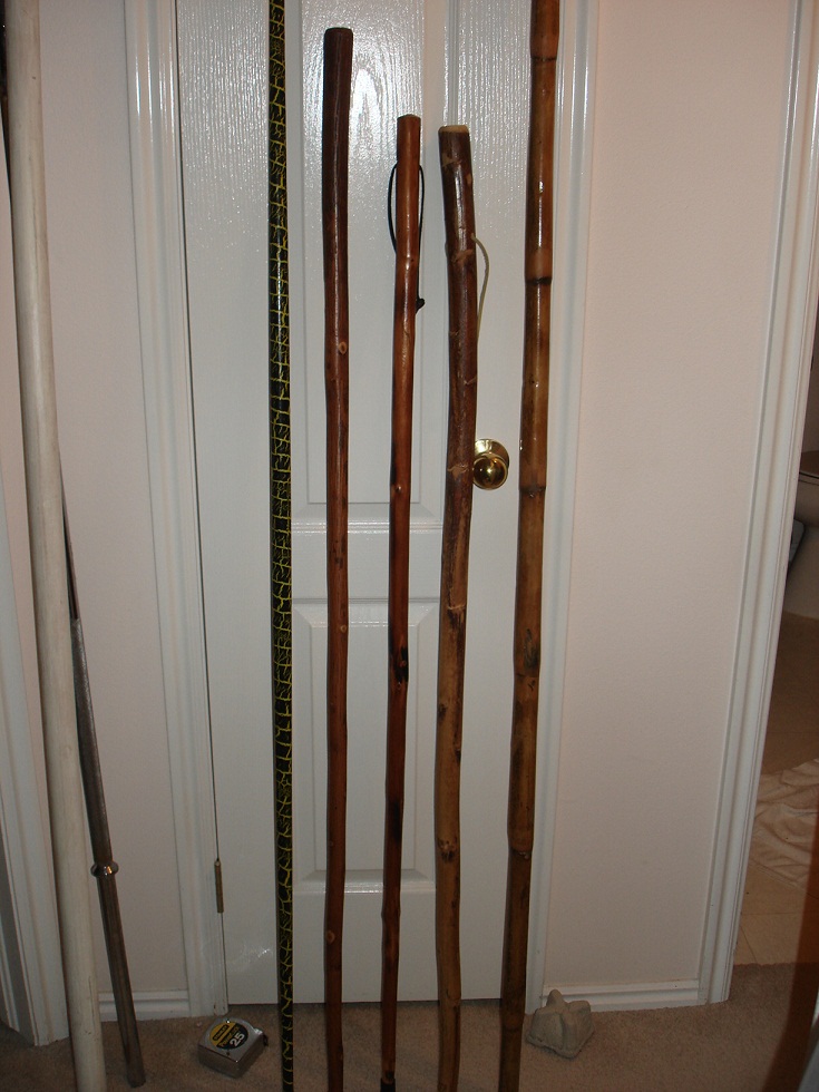愛收集棍子[登山用]中間三支較短的,登山時真有用。左邊花紋是武術用的兩頭細長六尺,看到覺得好奇就買了重量輕[但會用的是有殺傷力]:)