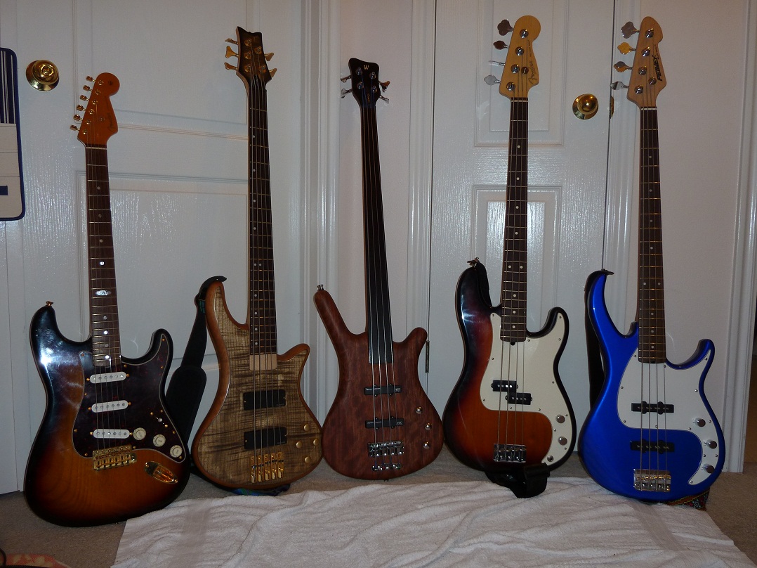 四把電貝士 一把電吉他 都是美國製造的[中間一把是德國製的]:D