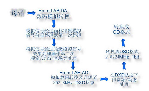 雨林於2008年面世的A2HD雙重模擬母帶處理技術,竟能在短短數月之後就進化至第二代的A2HD2,其致力為樂迷帶來更佳聽覺享受的製作方針,絕對值得大家敬佩。從雨林提供的流程圖來看,最大的不同是,A2HD(第一代技術)在信號作第二次ANALOG處理器處理後,便經EMM LABS的AD機升頻至DSD格式(2.8224MHZ 1BIT),重新錄製,再轉換成16BIT的CD格式,而新一代(A2HD2)則在ANALOG二度處理後,經EMM LABS的AD升頻至352.8KHZ DXD狀態,在這狀態下作第二度頻寬、動態處理,然後才轉回DSD格式(1BIT)再轉為CD格式。這張A2HD2專輯,在音色的自然細膩性,以至歌者在用情高歌時的情感描繪力,都獲得了可聞的改善。