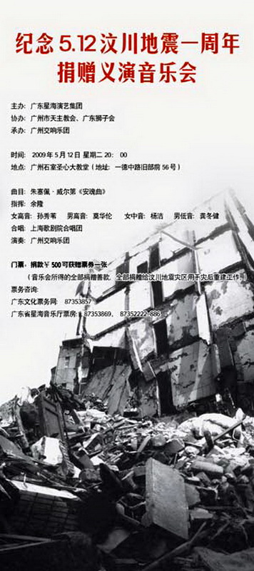 為紀念5.12汶川大地震一周年,繼續支援四川災區災後重建,由廣東星海演藝集團主辦,廣州市天主教會、廣東獅子會協辦,廣州交響樂團承辦的“紀念5.12汶川地震一周年捐贈義演音樂會”於2009年5月12日晚上8時在廣州石室聖心大教堂舉行。