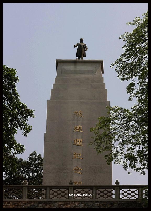 黃埔軍校後山的八卦山頂建有孫總理紀念碑,碑頂塑有孫總理銅像。1928年孫總理紀念碑奠基,1930年9月26日落成,碑的造型可以說是獨具匠心、構思非常奇巧的,它遠看猶如一個巨大的“文”字聳立天穹。孫中山名文,號逸仙,碑上的“文”字則暗含了孫文的意思。細看銅像和碑身是“文”字的一點,兩邊的階梯交叉而上,構成“文”字的一撇和一捺。碑座正面刻有“親愛精誠”四個大字。“親愛精誠”是軍校的校訓,其意是,大家要互助互愛,真誠合作。紀念碑四面都刻有碑文。
