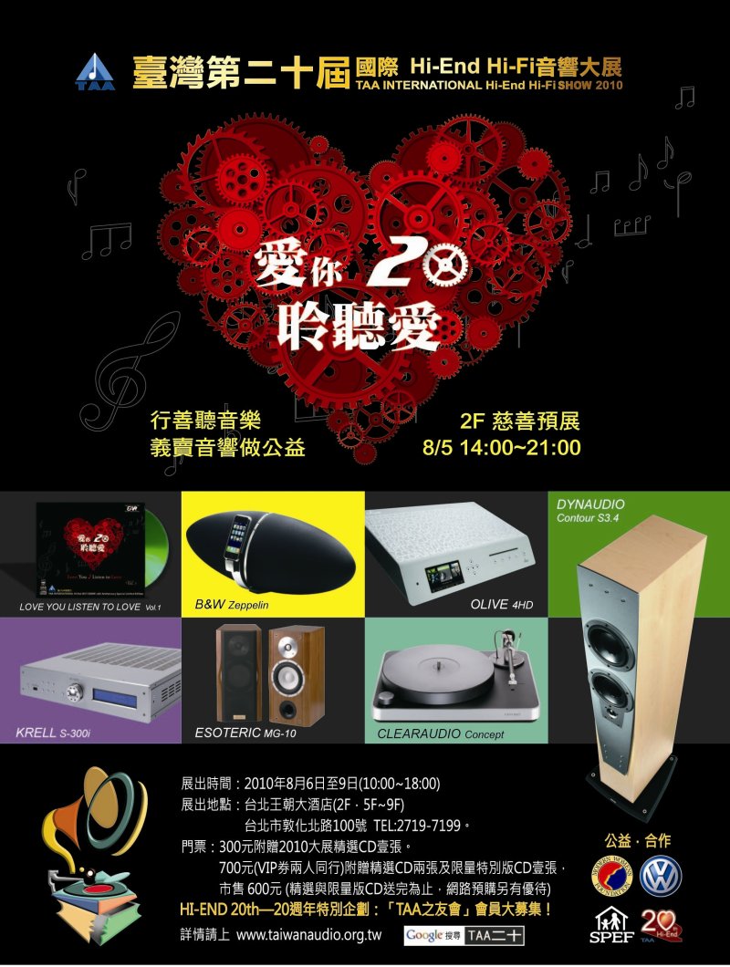 慈善拍賣: 由 TAA臺灣音響發展協會、Volkswagen總代理太古標達汽車、小高音響、大器國際、亞柏利國際、皇佳國際、鈦孚音響、勝旗電器、MY-HIEND.COM、東億視聽、瑋秦音樂、世界腕錶雜誌等公司提供。