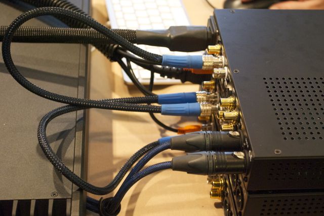 我問他這三個Mytek 192 疊在一起,後面又有幾條clock線接來接去是怎麼回事?