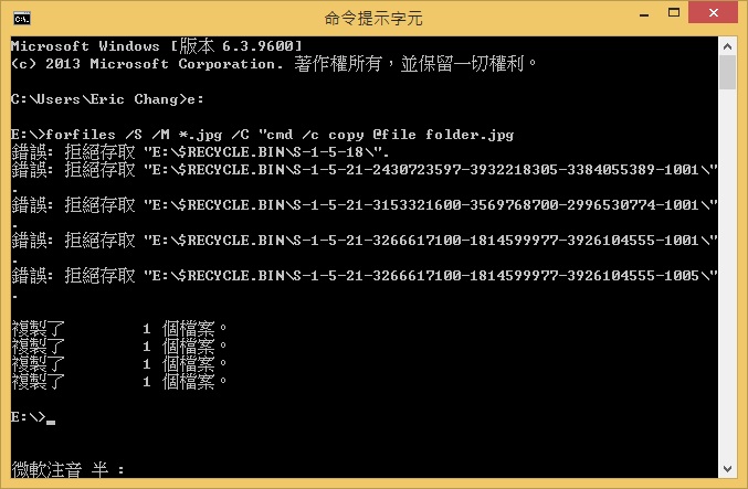 接著開啟cmd,鍵入 e: 進入E槽,在鍵入 forfiles /S /M *.jpg /C "cmd /c copy @file folder.jpg"