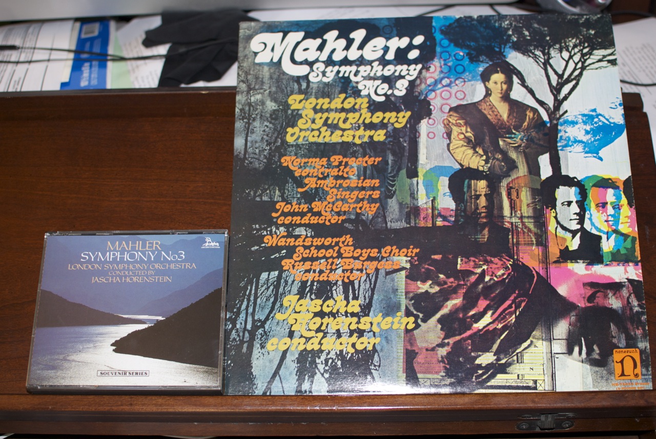 前一陣子買到這套馬勒第三(Horentsein指揮倫敦交響樂團)的唱片。封面實在有夠難看,還以為是印刷廠套色套錯了。