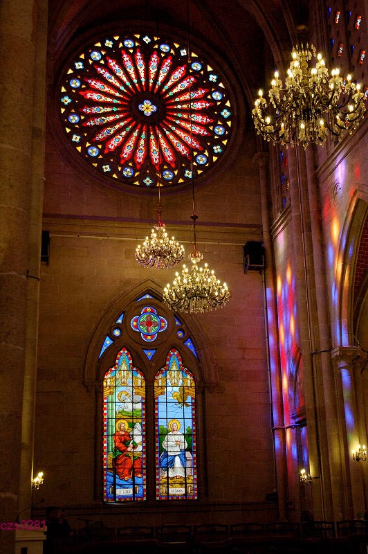 教堂屬哥特式建築,一對巍峨高聳的雙尖石塔,高插雲霄。石塔中間西側是一座大時鐘,東側是一座大鐘樓,四具從法國運來的大銅鐘;堂內是尖形肋骨高叉的拱形穹窿;正面大門上面和四周牆壁分佈的花窗櫺,都是合掌式,所有門窗都以法國製造的較深的紅、黃、藍、綠等七彩玻璃鑲嵌。這玻璃可避免室外強光射入,使室內光線終年保持著柔和,形成慈祥、肅穆的宗教氣氛。
