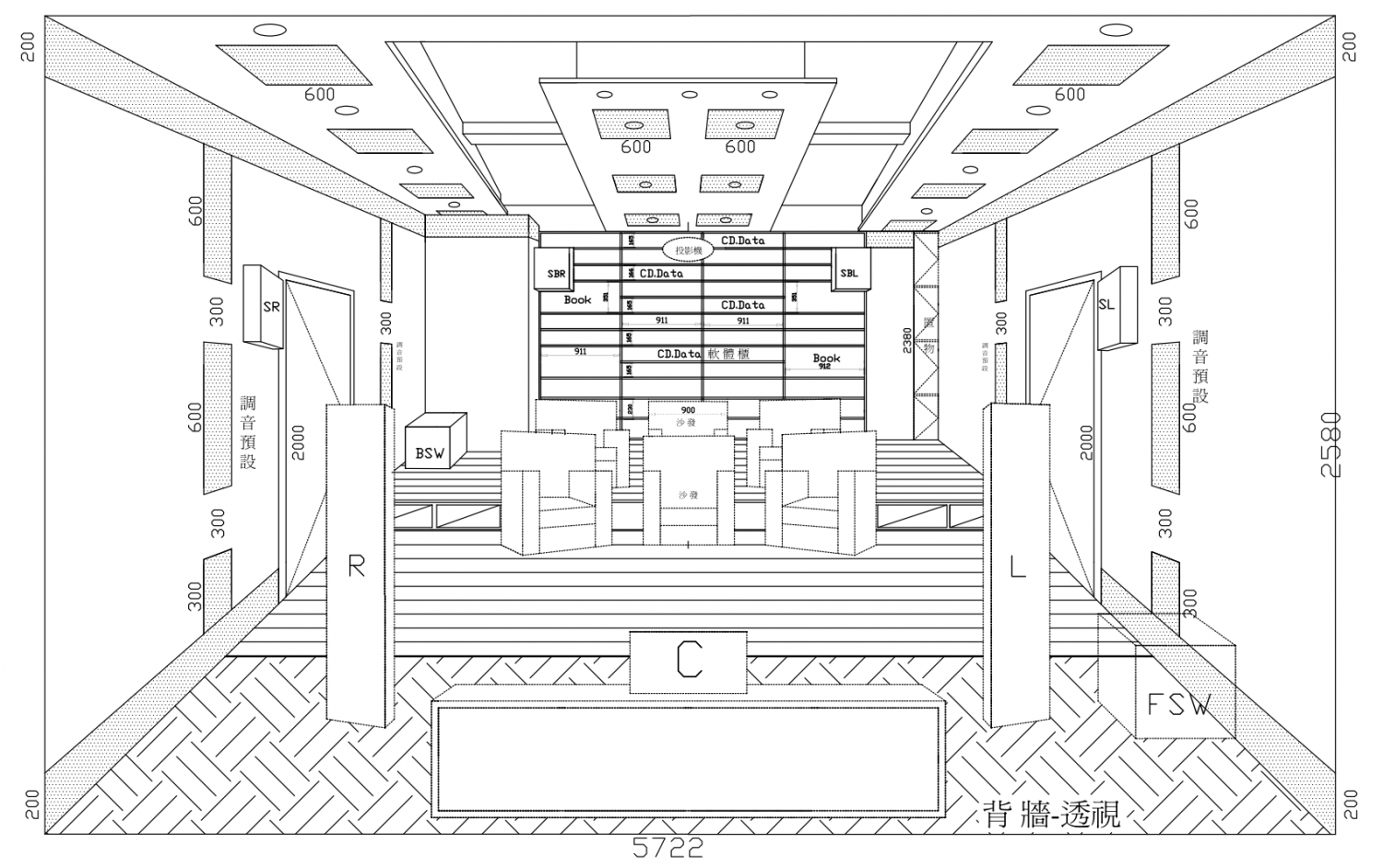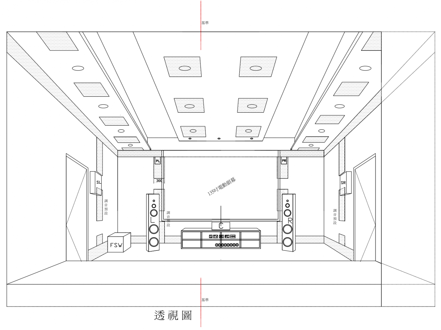 包樑均等.空調隱藏.燈具配置.銀幕預設.間/直接照度考量之後的天花板..打點點600mm框內就是預設調音板位置.