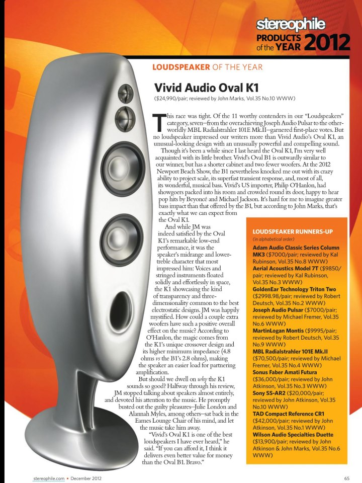 Wow, Eight years after launching the Vivid Audio K1 it takes the honour of being named Stereophile Loudspeaker of the year...