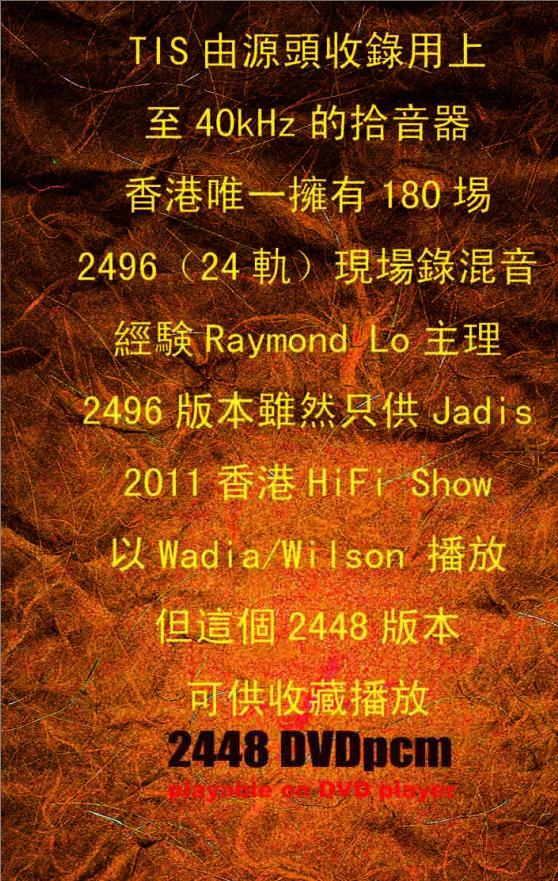 1.重新以TIS Jadis Showcase2011發行旧歡如夢 2448 (24bit48k DVD).作為預告2011 Jadis showcase 24HD,將首次於香港音响展播放TIS 24HD的序幕展開