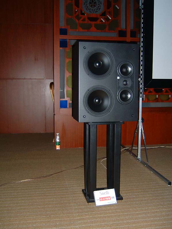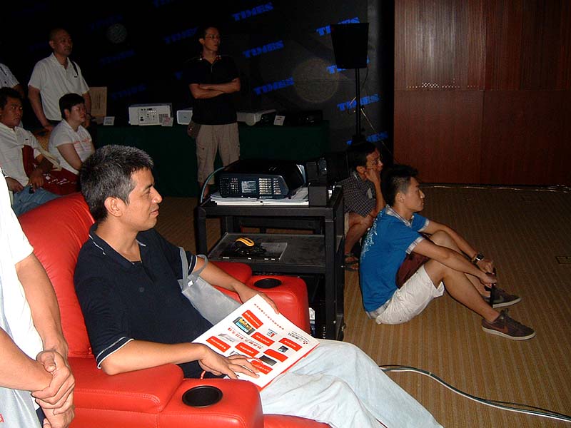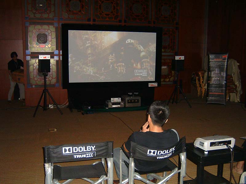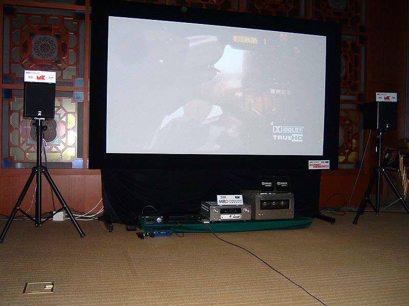 Stewart 170寸弧形固定幕,是所有AV演示中最大的幕,價值12萬人民幣。音響系統也價值不菲,但聲效卻如三流的影院。影院調校也是一門學問,代理好像至今還不得要領。