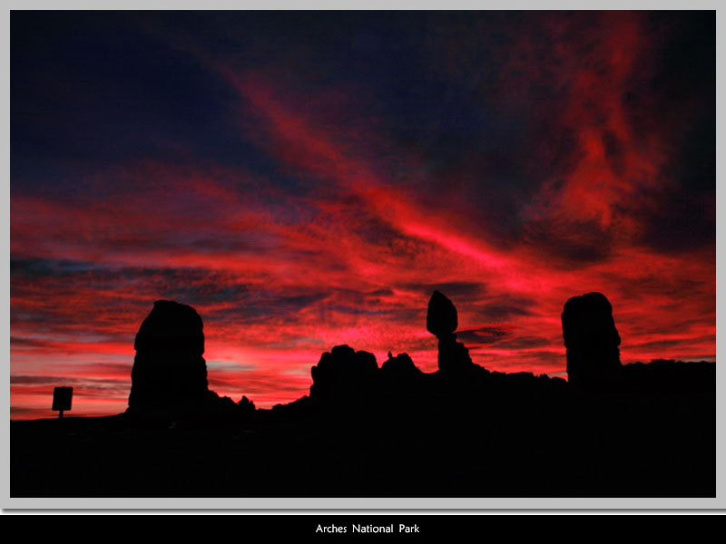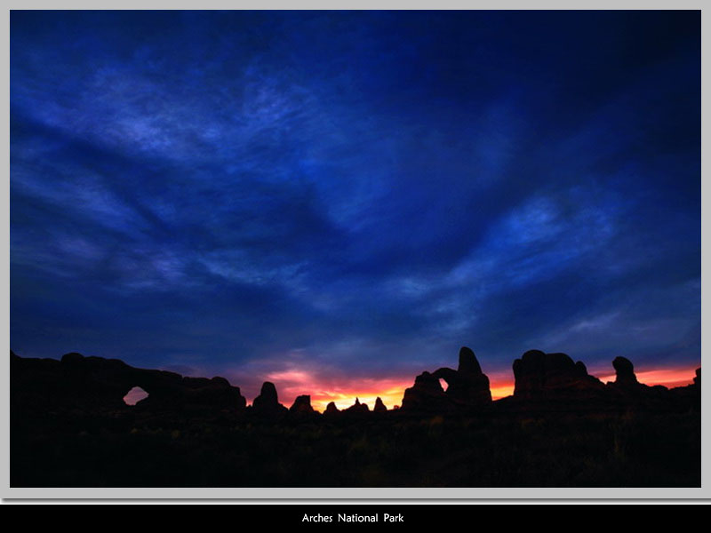 拱門國家公園(Arches National Park),這裏是世界上最大的自然沙岩拱門集中地之一,光是編入目錄的就超過二千個,其中最小的只有3呎寬,最大的Landscape Arch則長達306呎。公園裏不只有拱門,還有為數眾多的大小尖塔、基座和平衡石等奇特的地質特徵;所有的石頭上更有著顏色對比非常強烈的紋理。石頭的成因為三億年前這裏曾是一片汪洋,海水消失以後又經過了很多年,鹽床和其他碎片擠壓成岩石並且越來越厚。之後,鹽床底部不敵上方的壓力而破碎,複經地殼隆起變動,加上風化侵蝕,一個個拱形石頭就形成了。