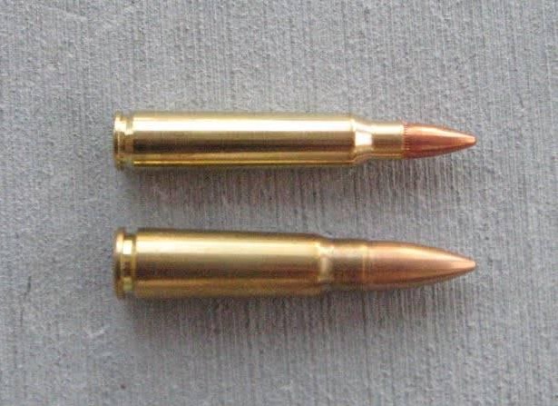 7.62x39 ( AK47 )下 vs 5.56 ( AR15 )上 子彈的比較