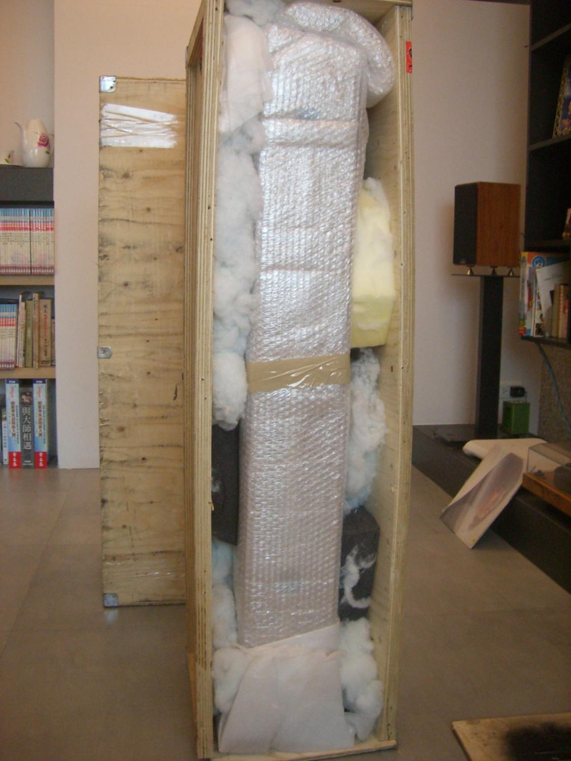 開箱前,木箱髒髒的,不知是不是UPS運送過程弄髒,感覺報關查驗的開箱封箱有些隨便,箱子四角並未封的很好,固定的白鐵角片扯下3個,吊掛在木箱上....