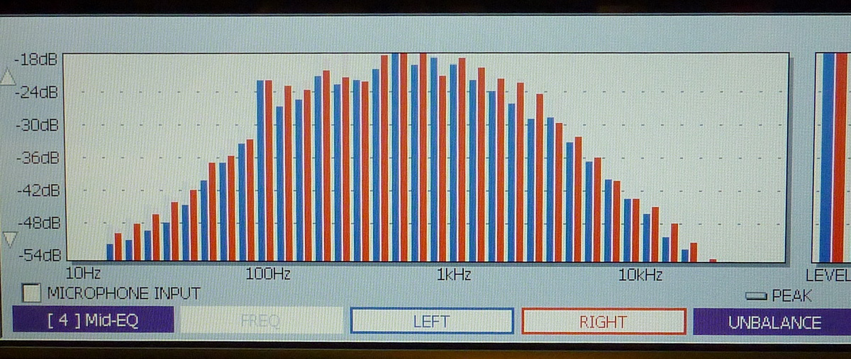 SOLSTICE 雍根Organ交響曲.第一樂章4分45秒CD訊號頻率/強度圖(spectrum analyzer)..測自家中EQ.100hz之後-陡降至少6dB(為1/4強度值).規程是1/3 octave 35band real time type..雖然粗略但可以窺見此刻-該會有多少低頻出現或表現.:o