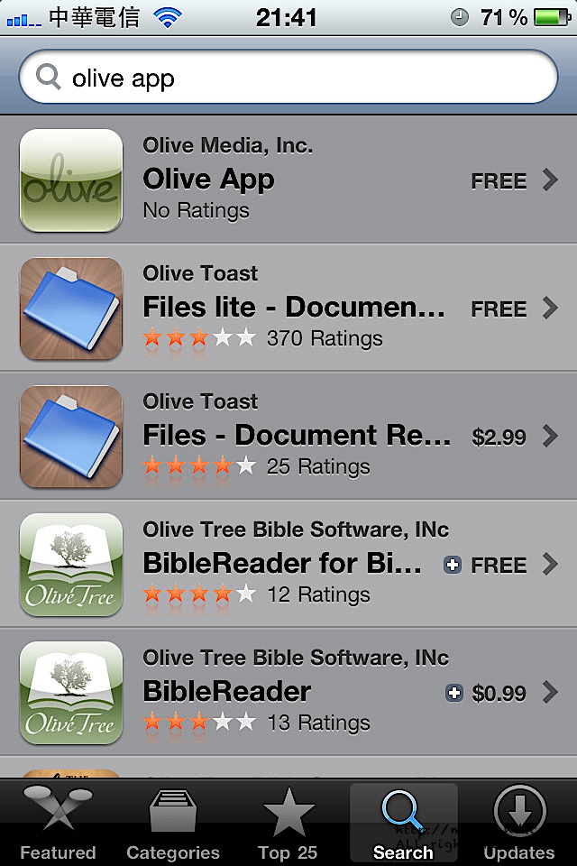 沒錯 第一個選項的 olive app 就是我們要的 點一下 看到右上方的 FREE 嗎 ?