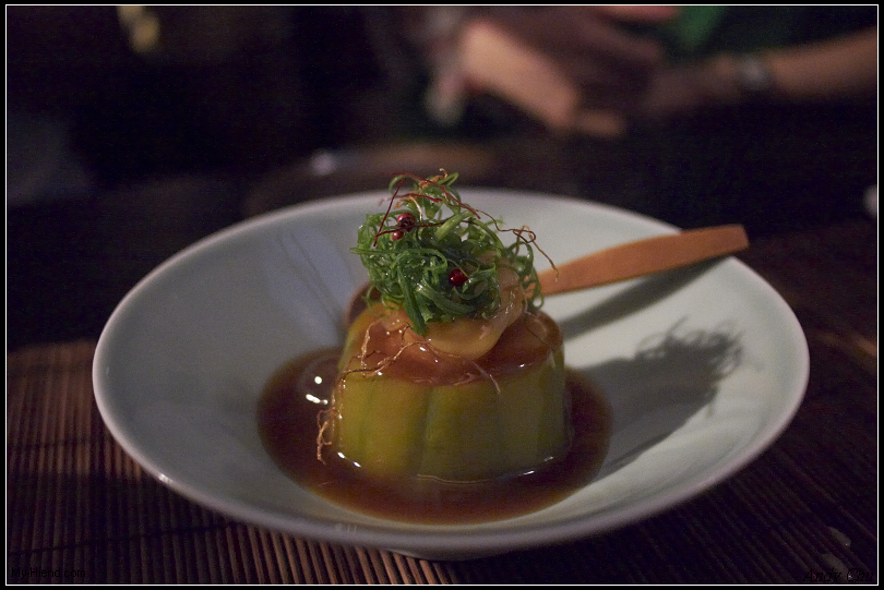 第二道菜,削皮絲瓜配干貝再淋上特製的醬