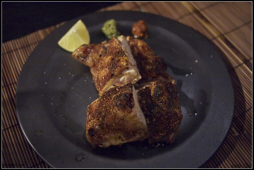 故意拿冷凍雞腿肉直接去烤,不退冰,達到外脆內嫩的效果